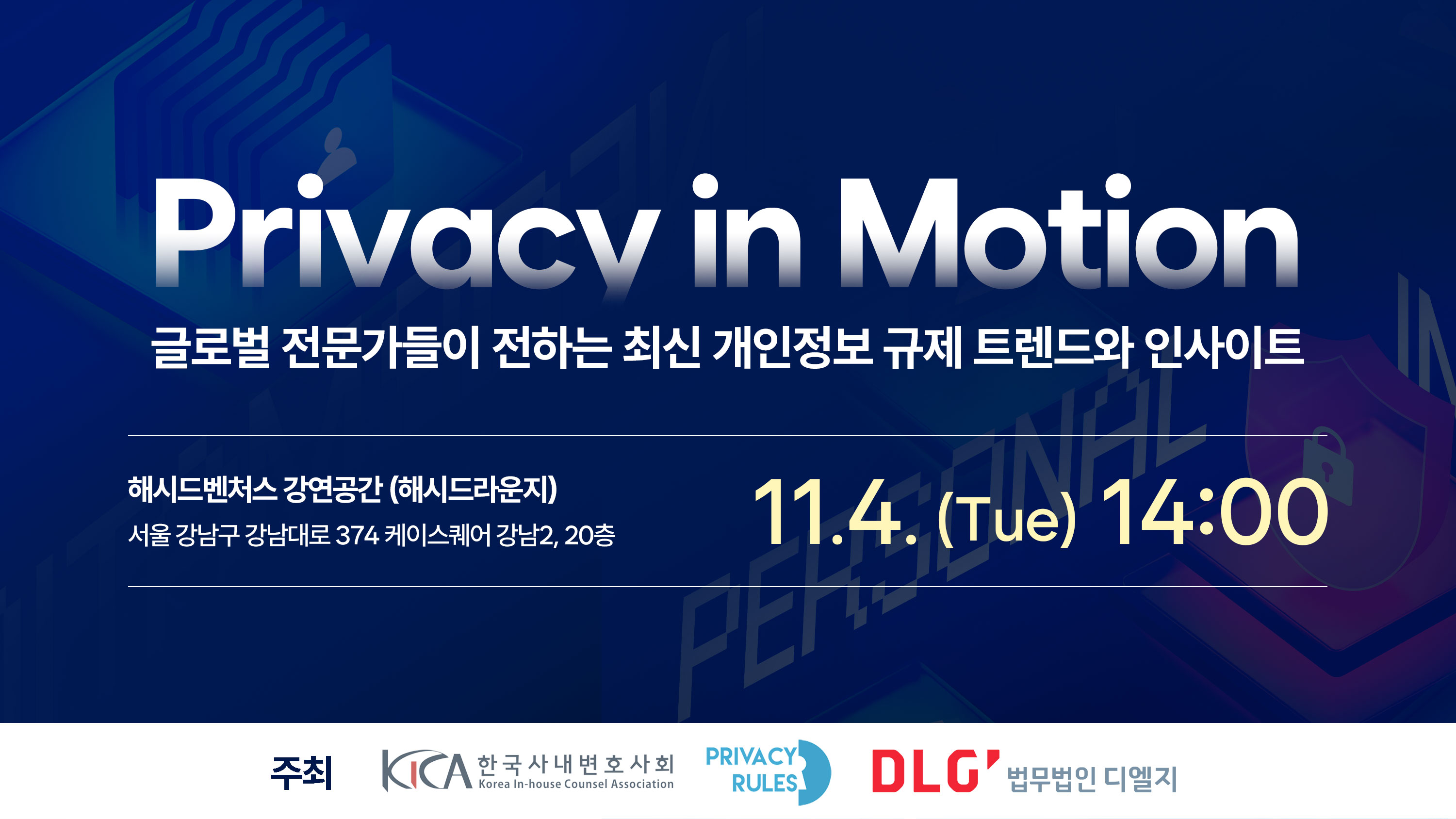 ๋ฒ๋ฌด๋ฒ์ธ ๋์์ง๋ ํ๊ตญ์ฌ๋ด๋ณํธ์ฌํ์ ํจ๊ป ๊ธ๋ก๋ฒ ๊ฐ์ธ์ ๋ณด๋ณดํธ ์ ๋ฌธ ๋คํธ์ํฌ PrivacyRules ์์ ์ ๋ฌธ๊ฐ๋ค์ ์ด์ฒญํ์ฌ, ์ต์  ๊ฐ์ธ์ ๋ณด ๊ท์  ํธ๋ ๋์ ๊ฐ๊ตญ์ ์ธ์ฌ์ดํธ๋ฅผ ๊ณต์ ํ๋ ์ธ๋ฏธ๋ ใPrivacy in Motionใ์ 11์ 4์ผ ๊ฐ์ตํฉ๋๋ค.